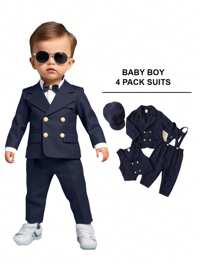 WimblieSHEIN 4pcs/Set Baby Boy Classic Gentleman Outfit, Including Long Sleeve Shirt With Bow Tie, Vest, Long Sleeve Jacket, Pants, Suitable For Birthday, Wedding, Christening, 1st Birthday Party, Children Performance, Wedding Ceremony