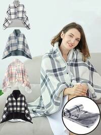 Preferred Gift Toy Store1pc Fleece Wearable Blanket, 80x135cm Plaid Lap Blanket, Comfortable Hooded Poncho With Buttons, Suitable For Bed, Sofa, Office, Gray & White Cozy Cloak With Buttons, Fuzzy Sleeveless Blanket, Women Shawl Wrap Suitable For Home, Office, Outdoor, Machine Washable