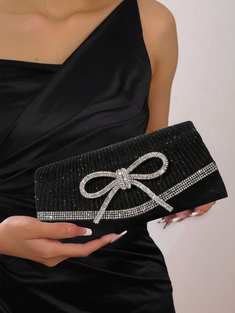 Luxury Rhinestone Bow Decor Evening Fashion Crystal Clutch Women Pleated Hand Bag For Party, Wedding