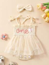 3pcs/Set Lovely Baby Girls" Soft Comfortable Breathable Letter Slogan Print Romper, Polka Dot Mesh Skirt And Headband