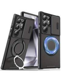Crow CaseCompatible With Samsung Galaxy S25, S24, S23, S22, S21, S20 Ultra/Plus A06, A13, A14, A15, A16, A26, A35, A36, A54, A55, A56, Note 20 Ultra Phone Case, With Sliding Camera Cover And [Full Camera Protection], 360° Rotating Invisible Ring Stand/Car Magnetic Stand/Matte Texture Heavy-Duty Shockproof Phone Protective Cover