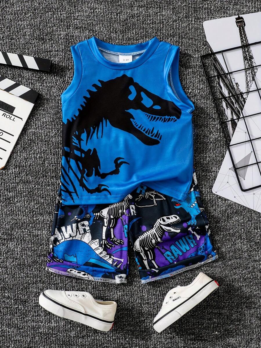 Young Boy 2-Piece Set For 3-7 Years Old Sleeveless Round Neck Dinosaur Print Top Shorts Suit Summer